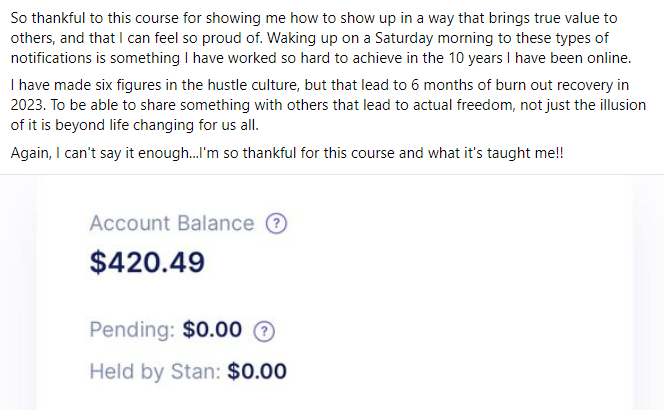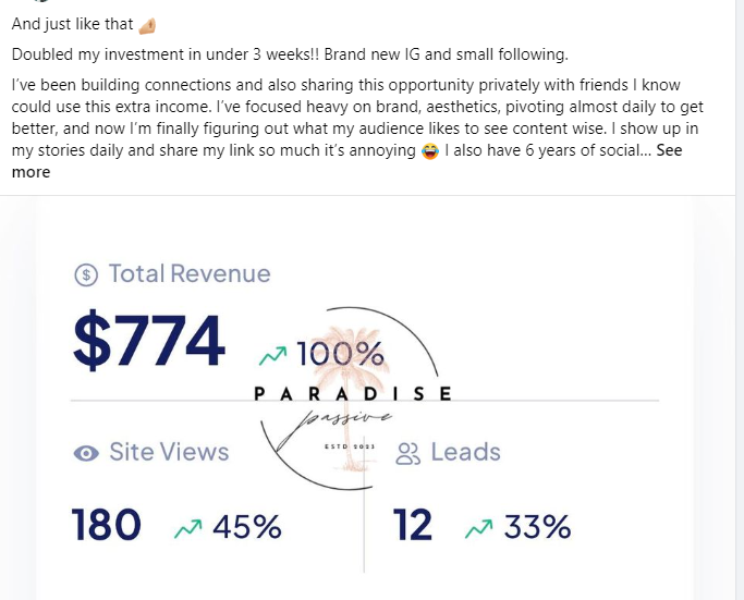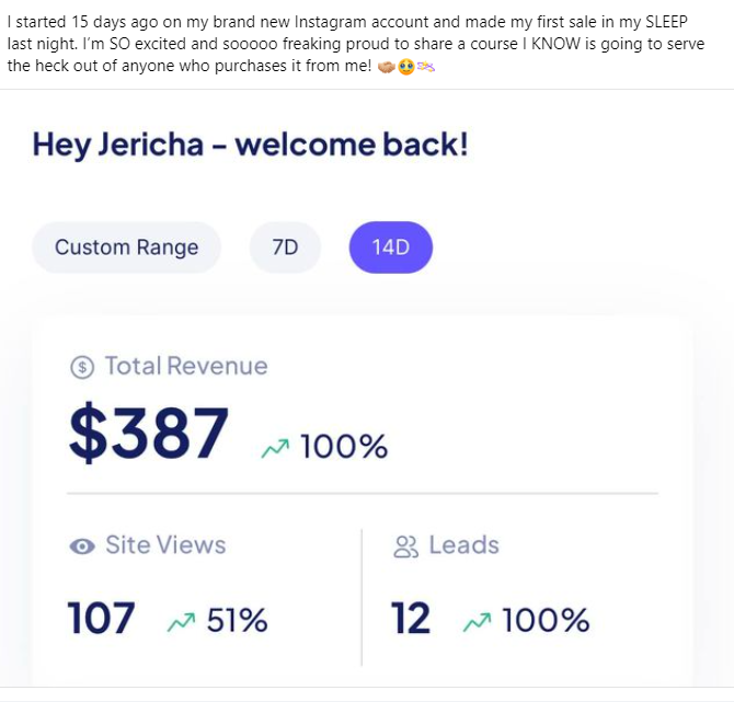 I began my journey in January 2024 and in my first 12 days made back my ENTIRE investment in the course and brough int over $2200 total!